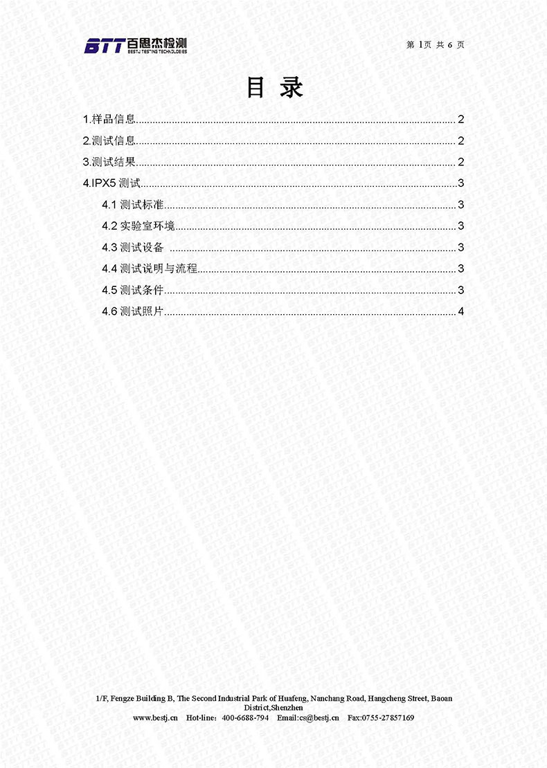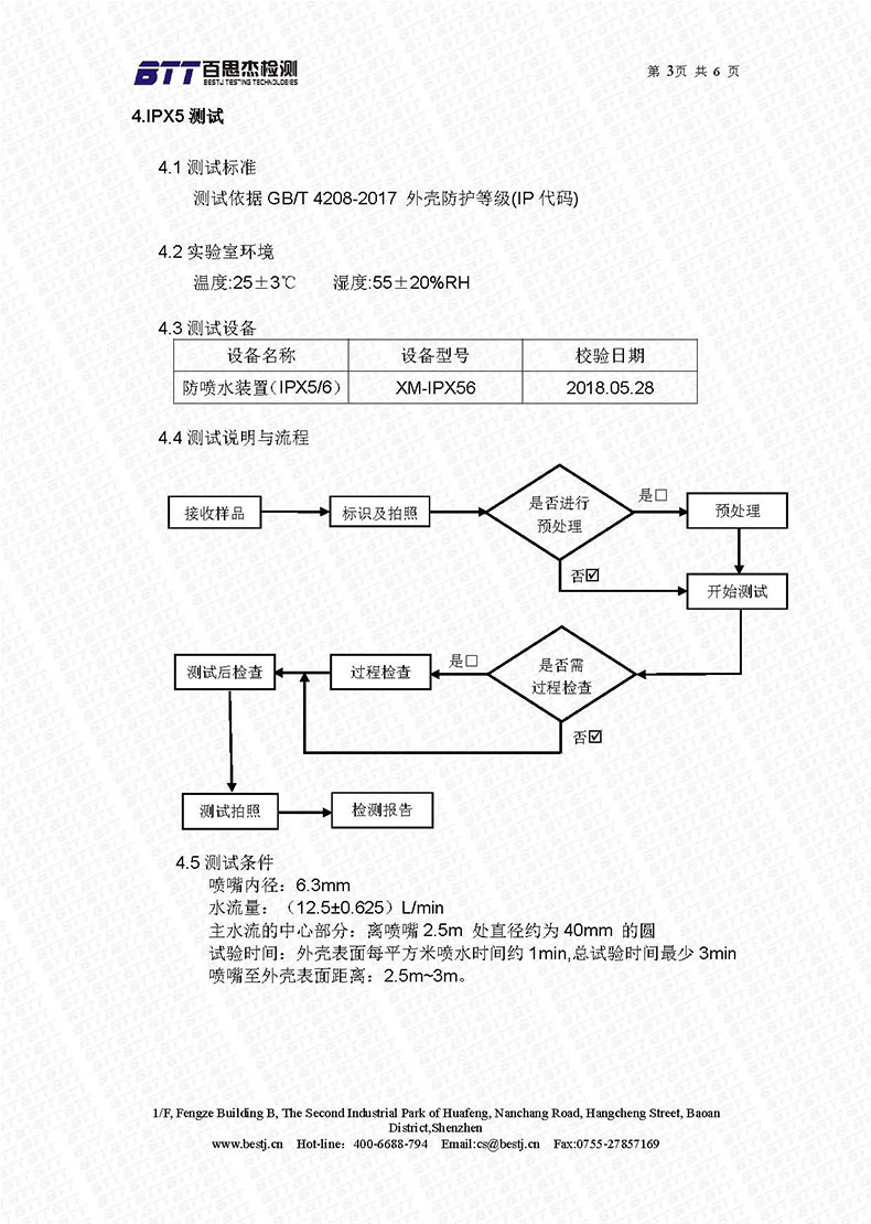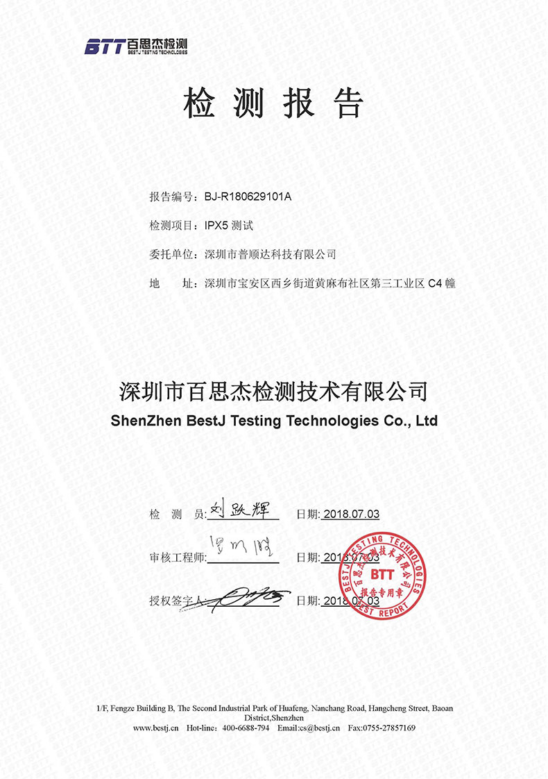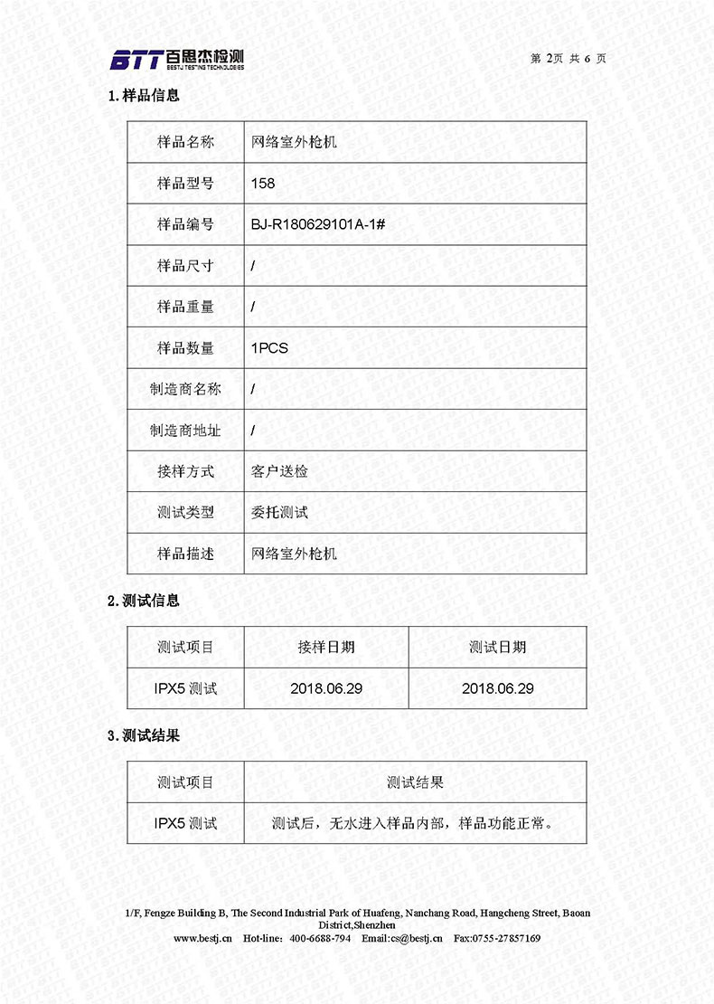 2018年7月,普順達(dá)的158型號室外槍機(jī),通過IPX5測試,該款攝像機(jī)具有室外防水功能,下面是檢測報告。